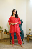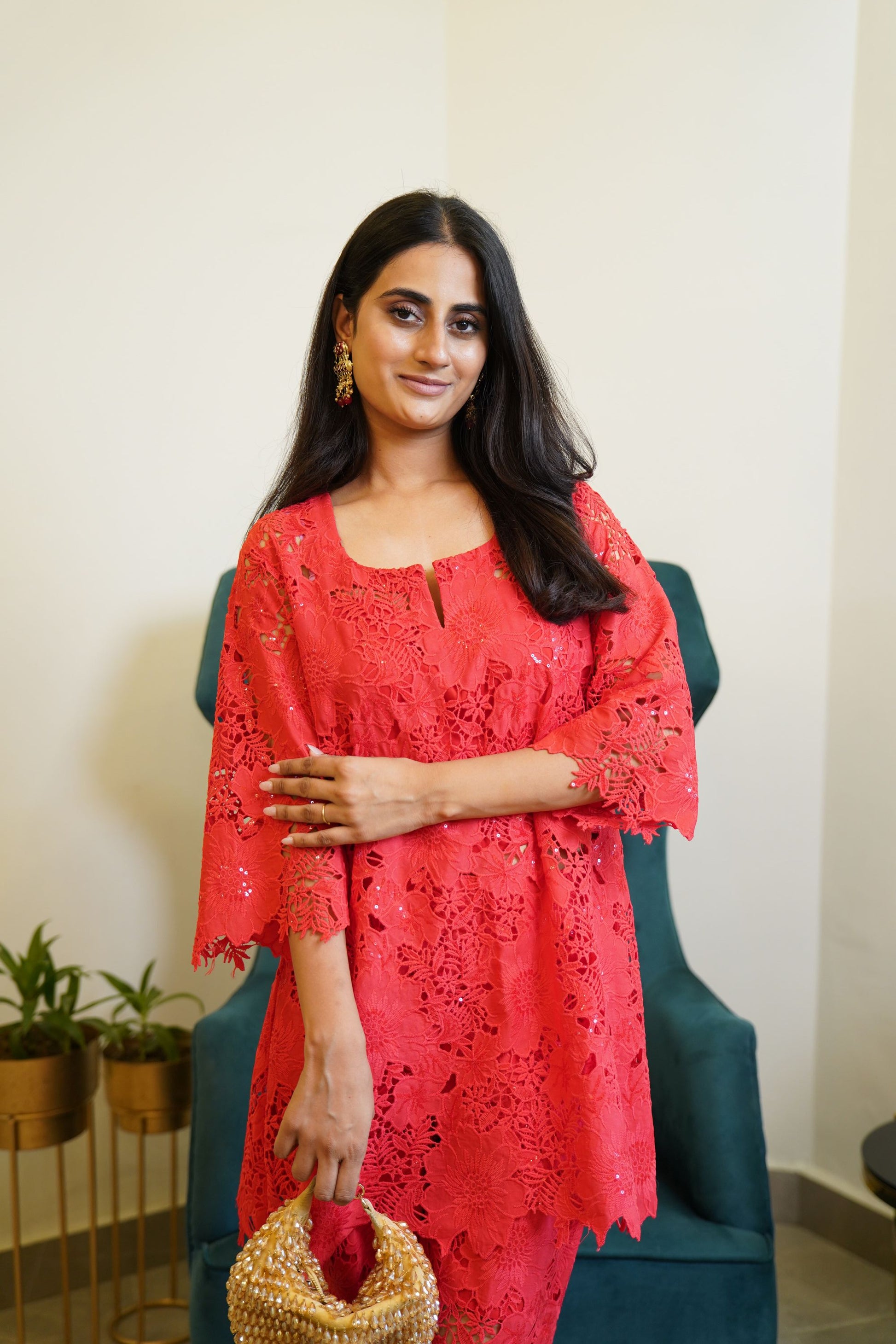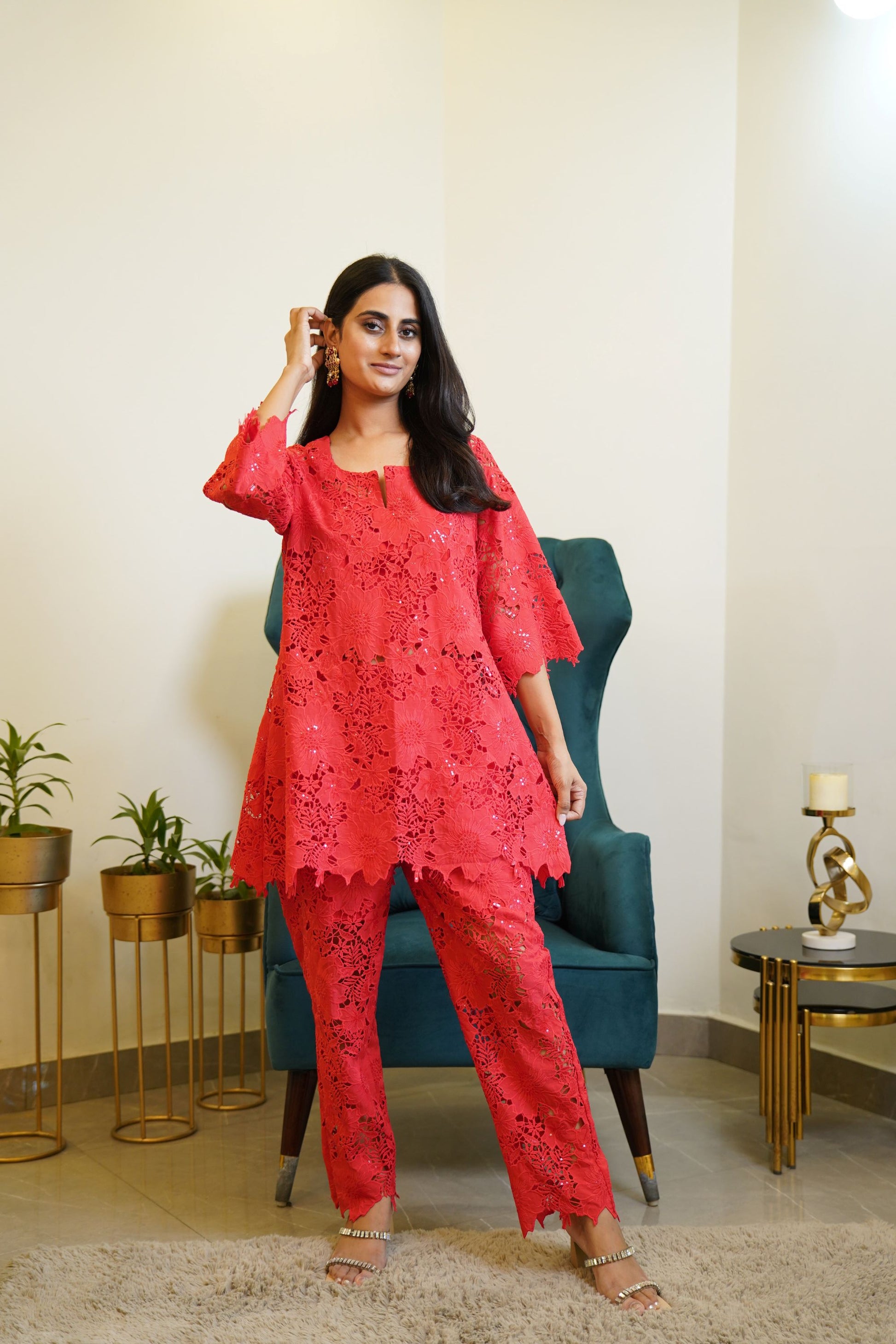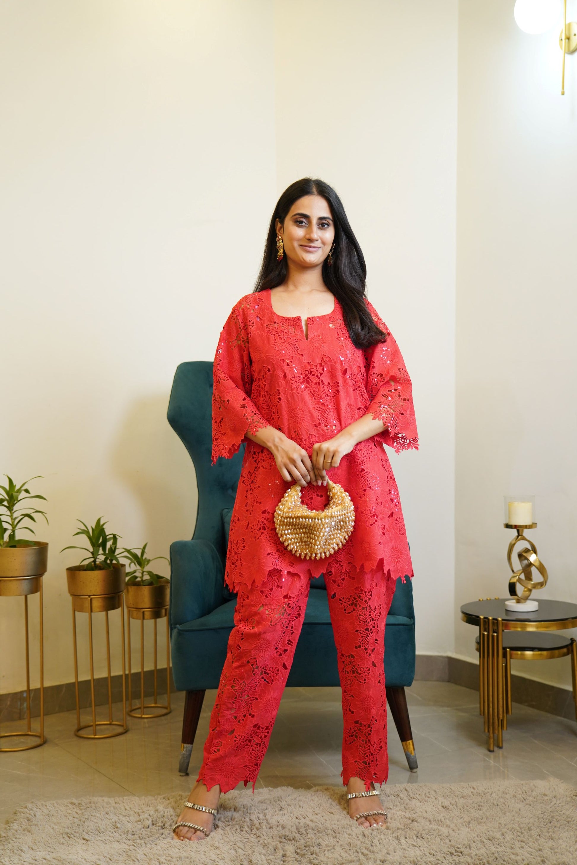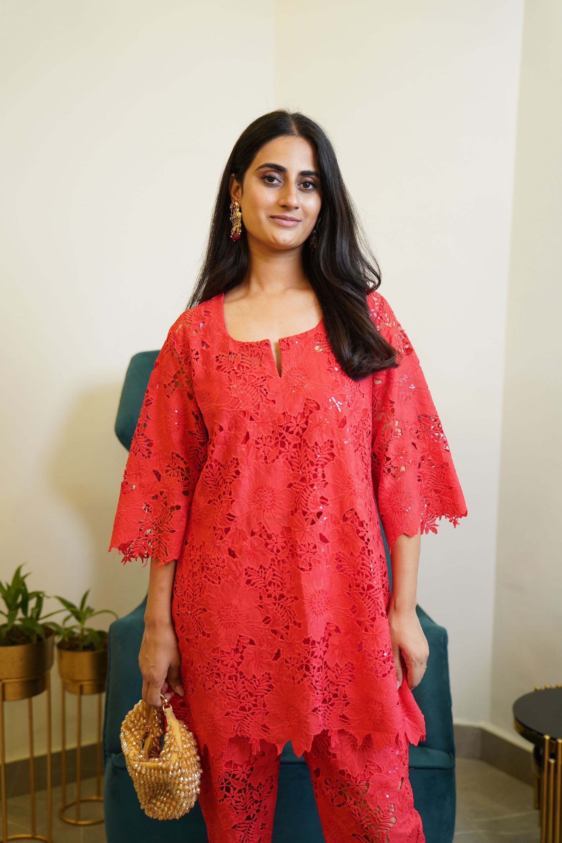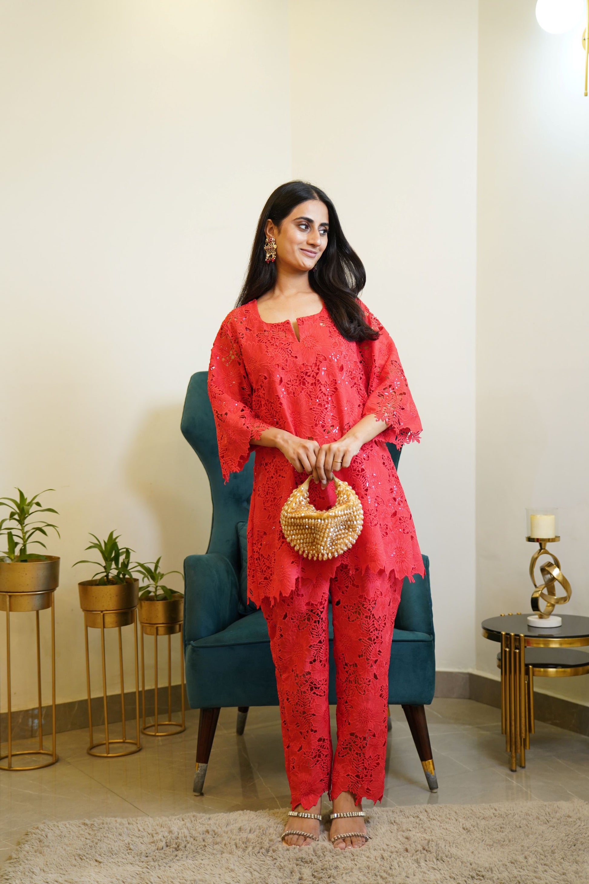 Featuring a relaxed-fit, knee-length tunic in bold red with intricate all-over cutwork embroidery. The neckline has a subtle slit detail and the edges , hem and sleeves , are scalloped, giving a delicate, handcrafted finish. Coordinated with straight-cut pants in the same cutwork fabric, carrying the same scalloped hemline for a seamless look.