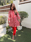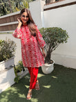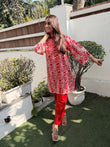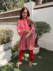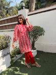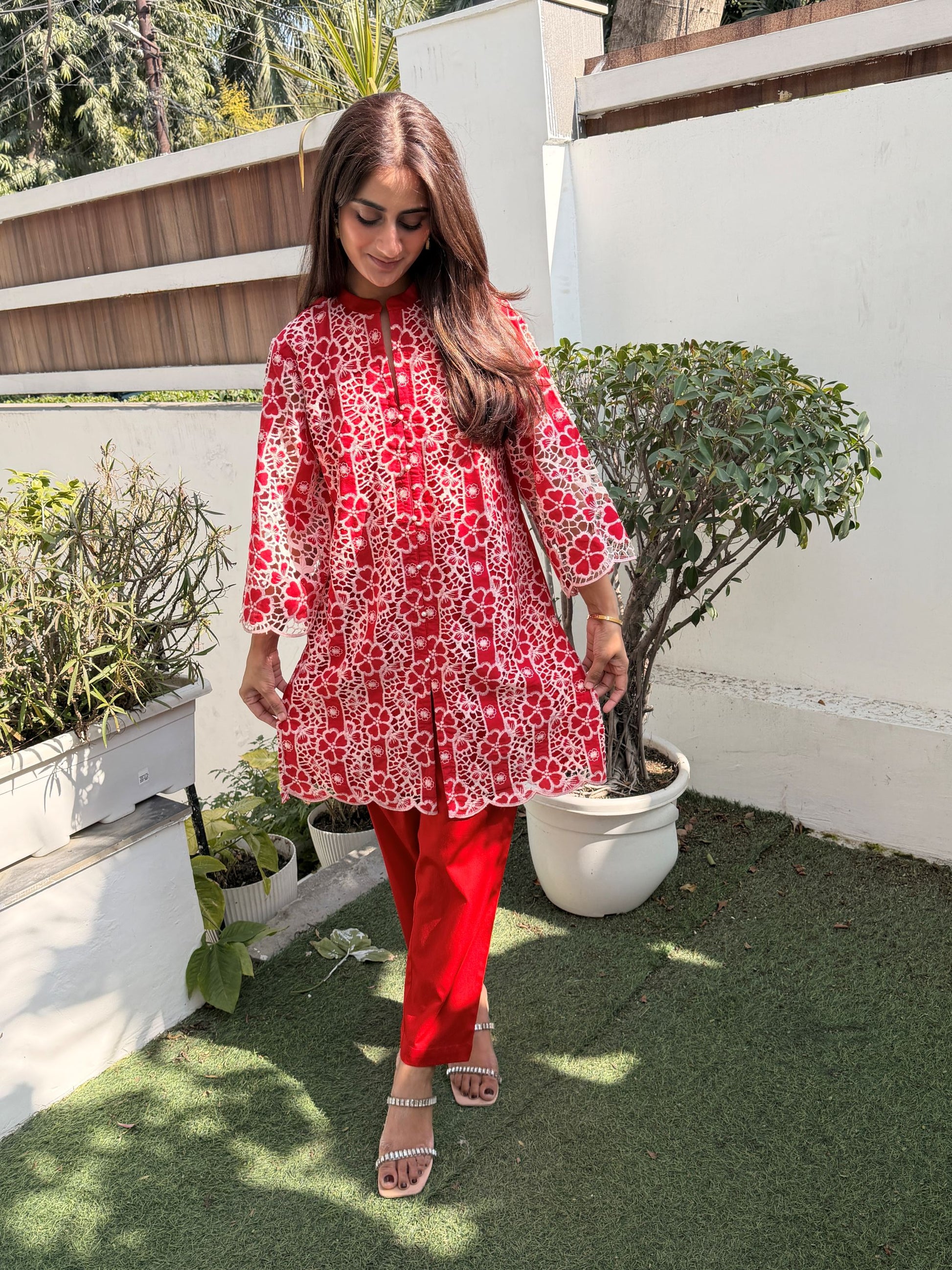 A Beautiful Red color Co-ord set in cut work embroidered high quality fabric .The shirt has V neck and has pearl detailed neck . It comes along with red colored straight fit pants, perfect for summer occasions.