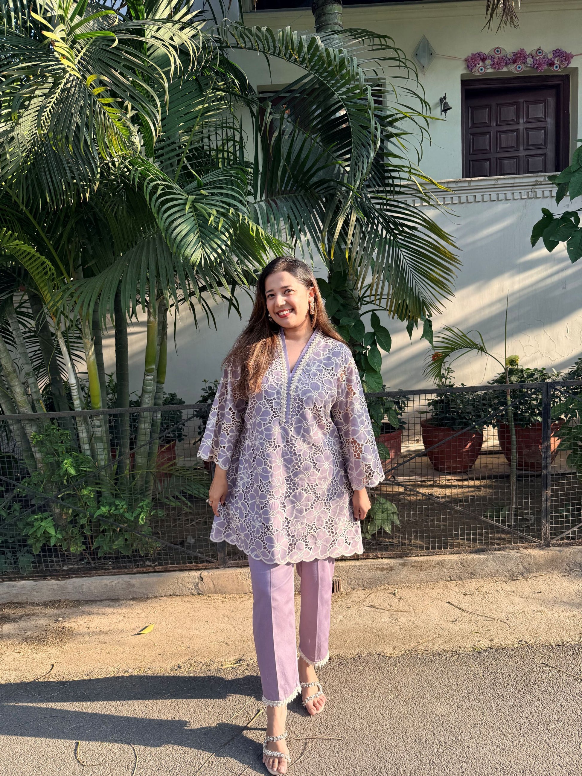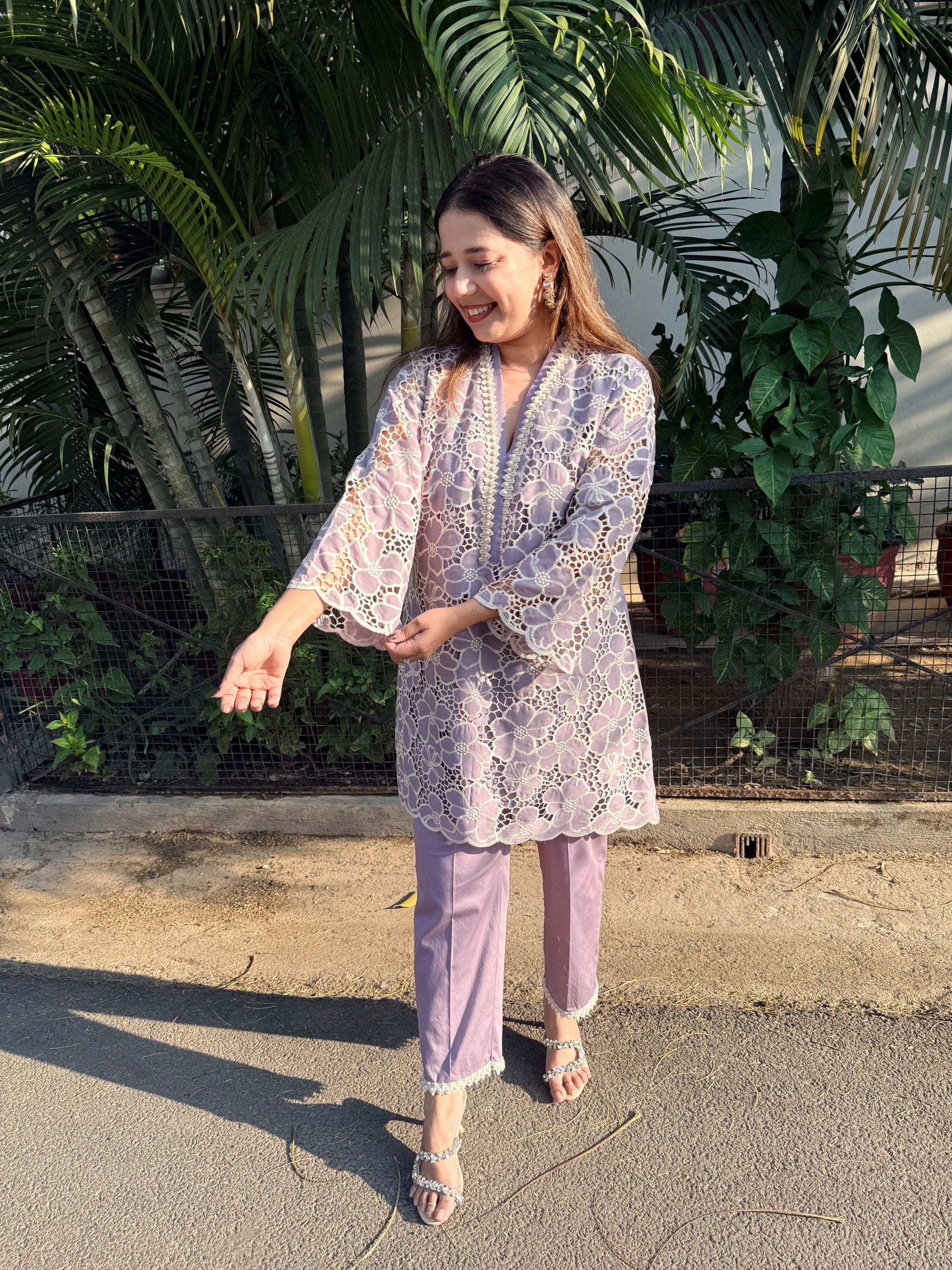 A Beautiful Lilac color Co-ord set in cut work embroidered high quality fabric .The shirt has V neck and has pearl embroidered neck . It comes along with pearl embroidered panel straight fit pants, perfect for summer occasions.
