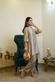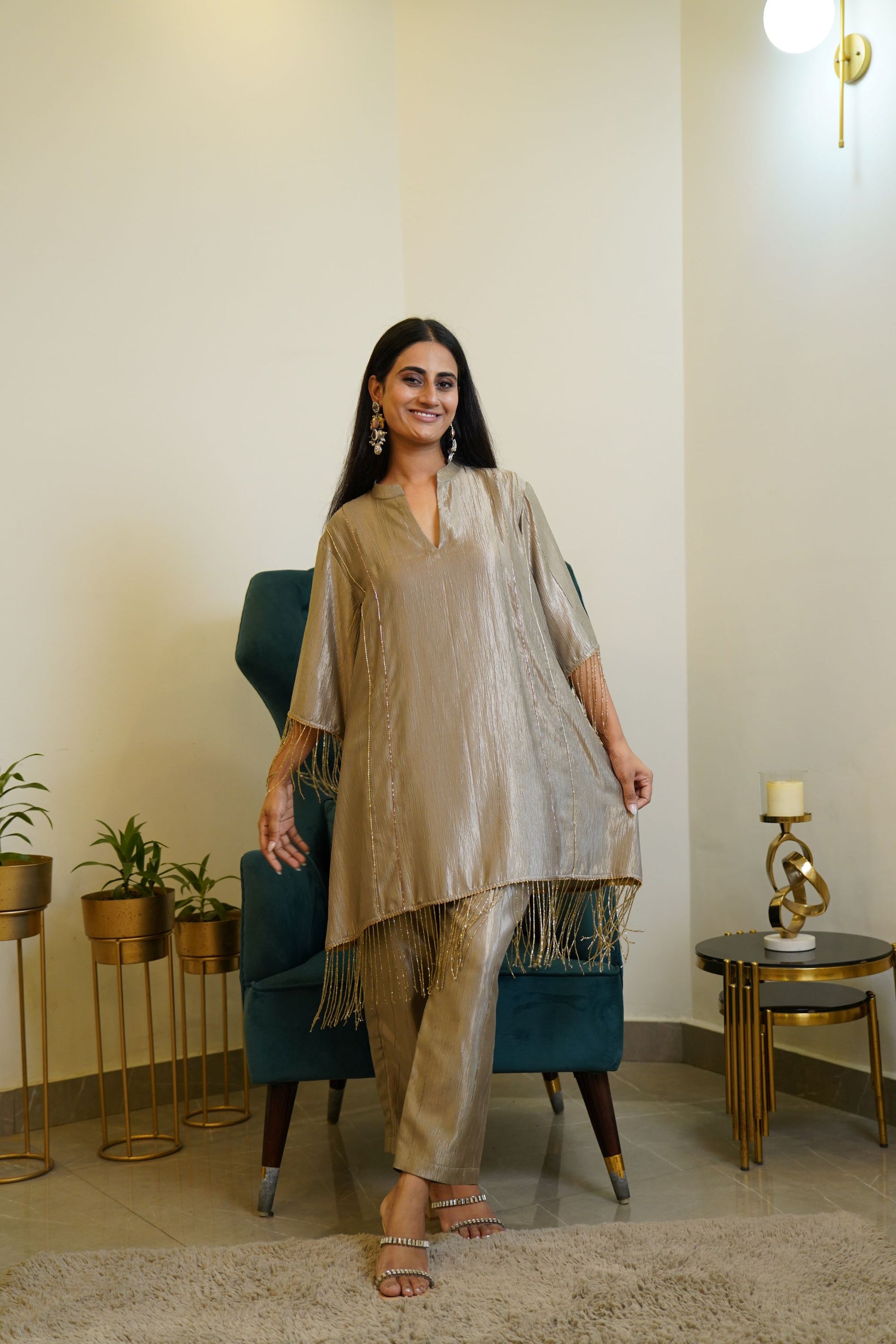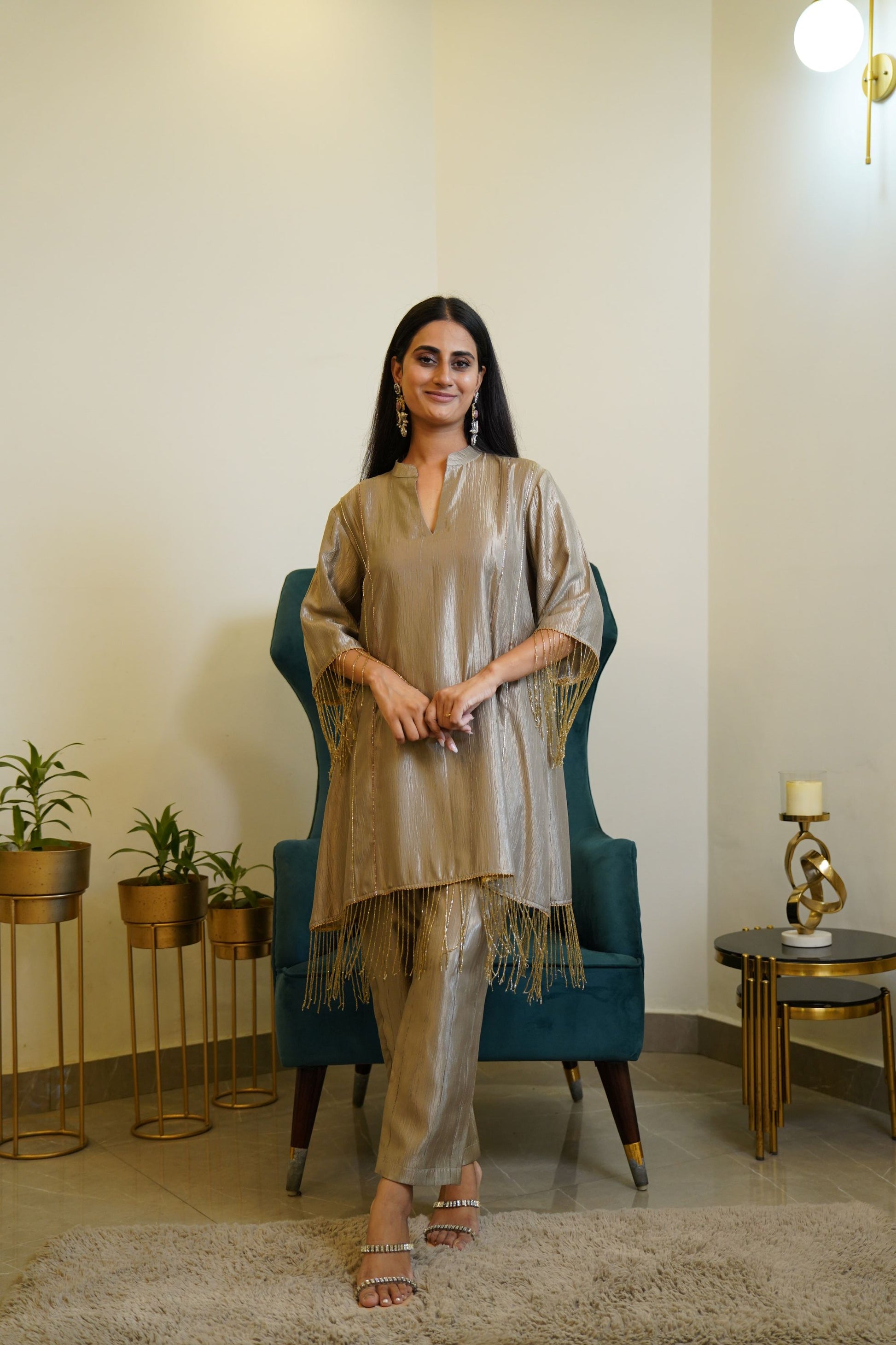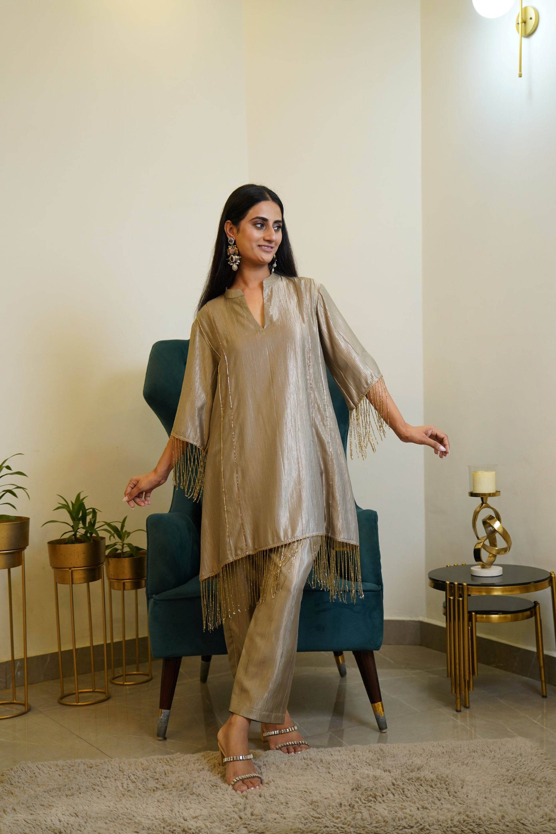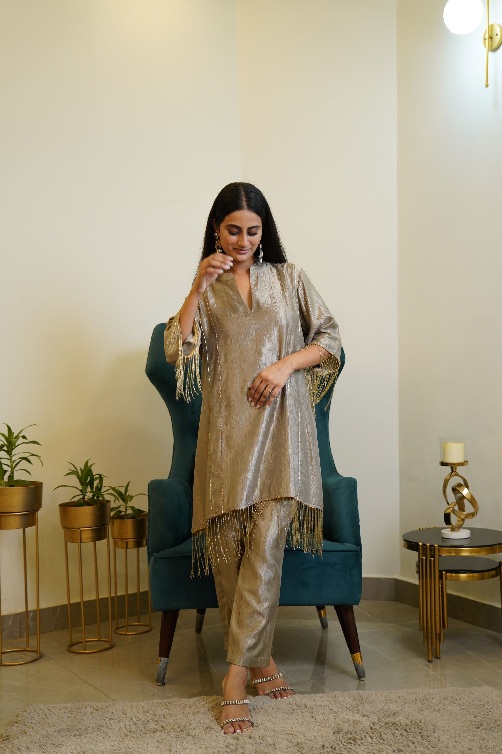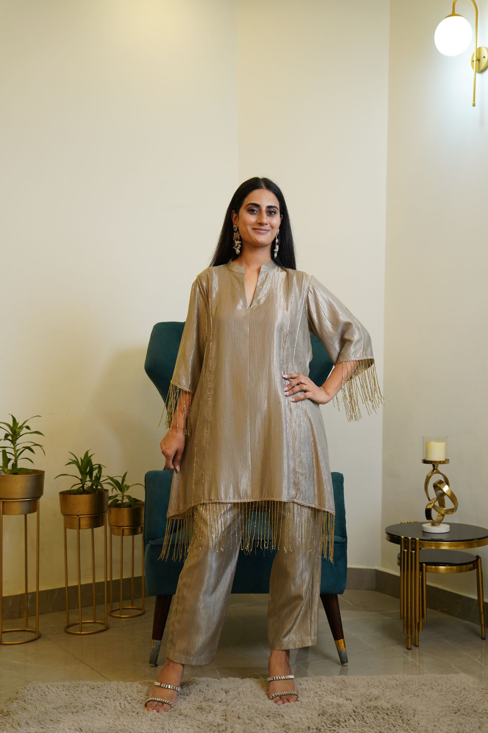 The kurta is crafted from a shimmering crushed silk fabric with a subtle metallic sheen. It features a V-notch neckline and relaxed straight silhouette for a chic and comfortable fit. The highlight of the outfit is the gold bead and tassel detailing adorning the sleeves and hemline, adding a playful yet luxurious touch . It is paired with matching straight-fit pants in the same crushed silk material, maintaining a cohesive and graceful look. The look is accessorized with statement earrings and embellished heel, completing the elegant festive vibe.