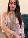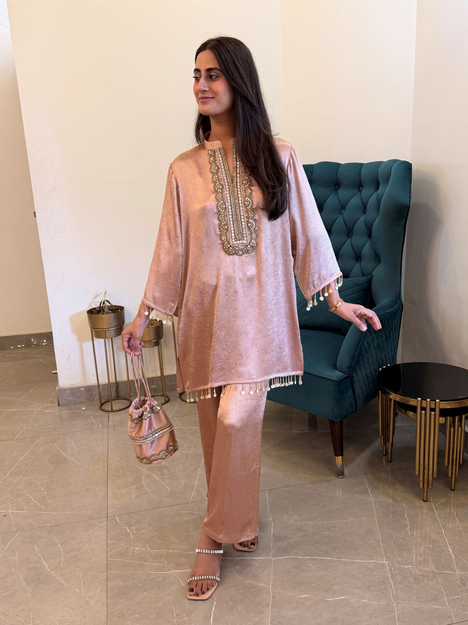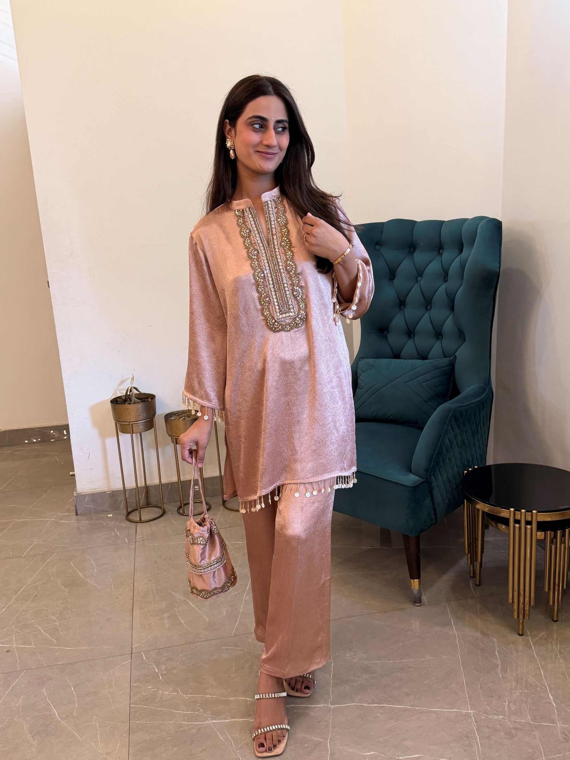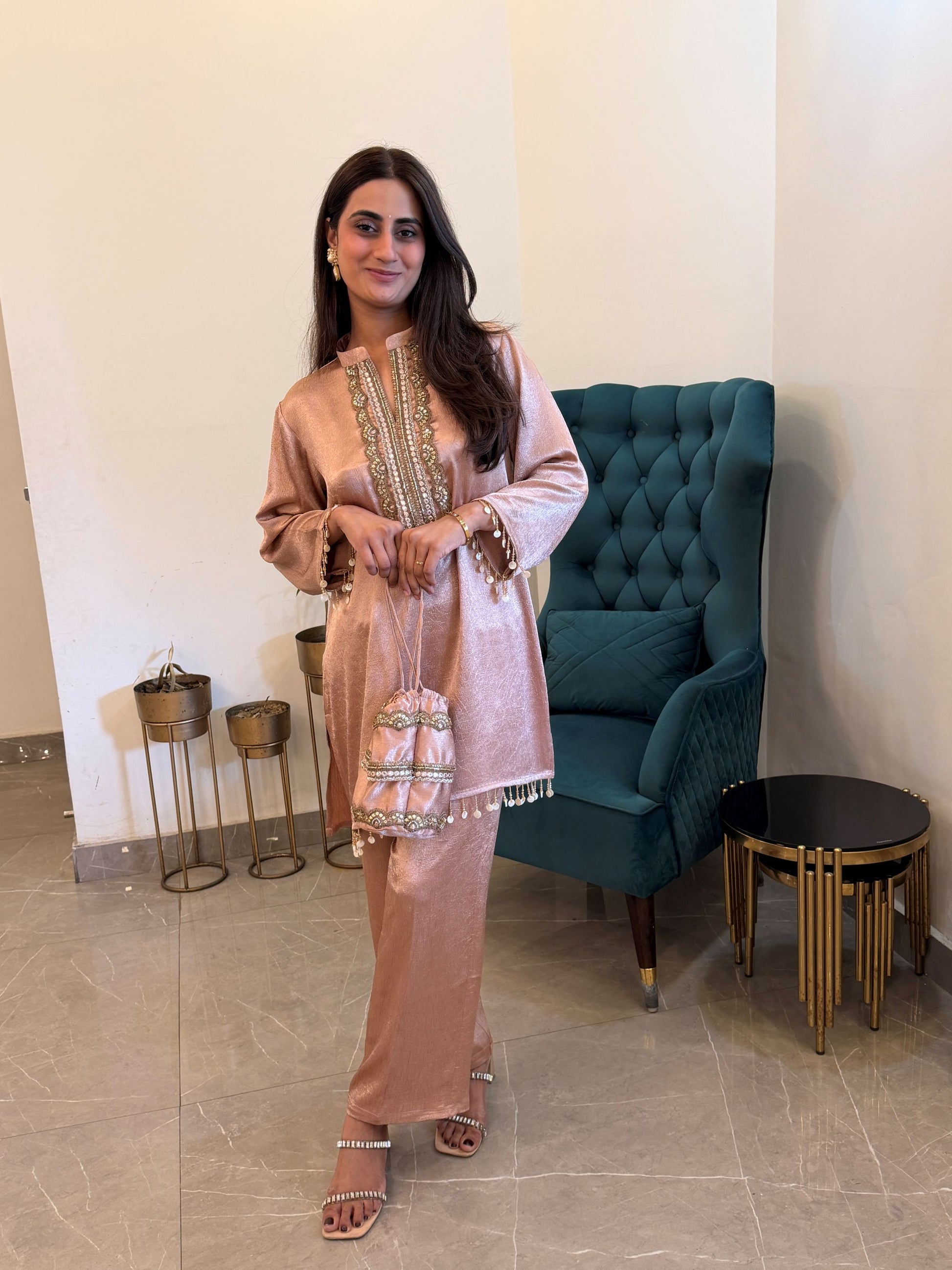 A soft pink ethnic co-ord set with a subtle she is a straight, knee-length kurta with full sleeves. It features delicate gold embroidery and embellishments running vertically down the center panel and along the neckline. The sleeve cuffs are accented with hanging pearl-like tassels, adding a feminine, festive touch. The hem of the kurta also has small dangling embellishments, giving it a graceful, flowy finish. The bottom is a matching straight-fit trouser in the same pastel pink shade, creating a clean, elegant. It comes with matching potli for the accentuated look.