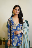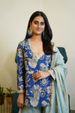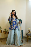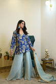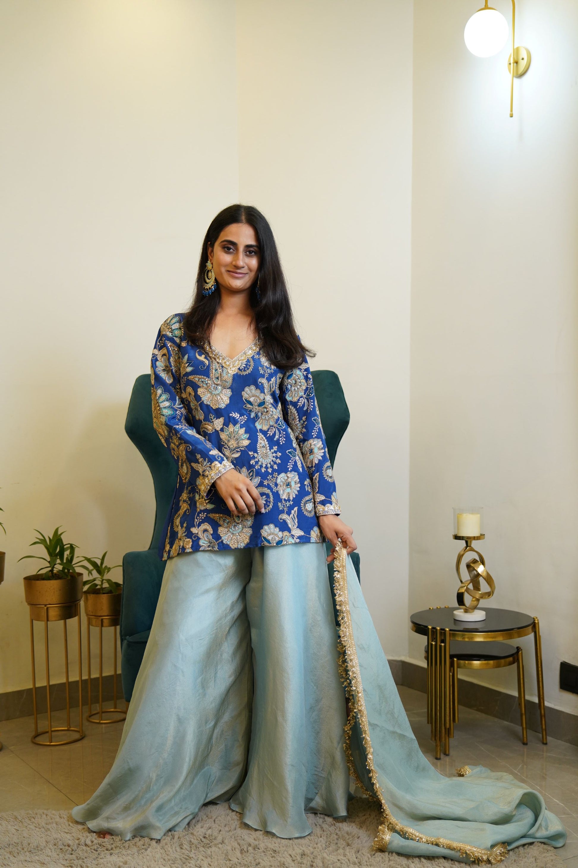 Featuring a straight-short cut kurta adorned with floral embroidery all along the shirt .The neckline is delicately embroidered to with cutdana detailing. It comes with tissue gherdaar sharara , It comes with same colored tissue dupatta .