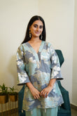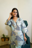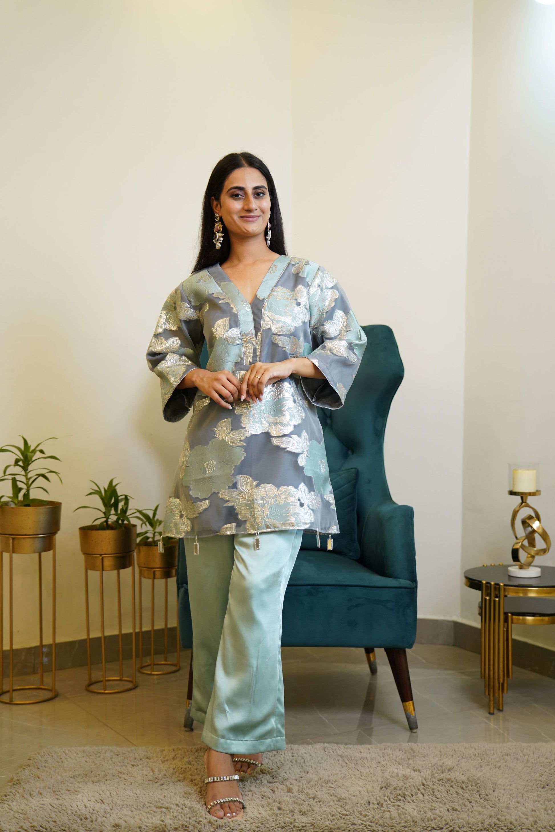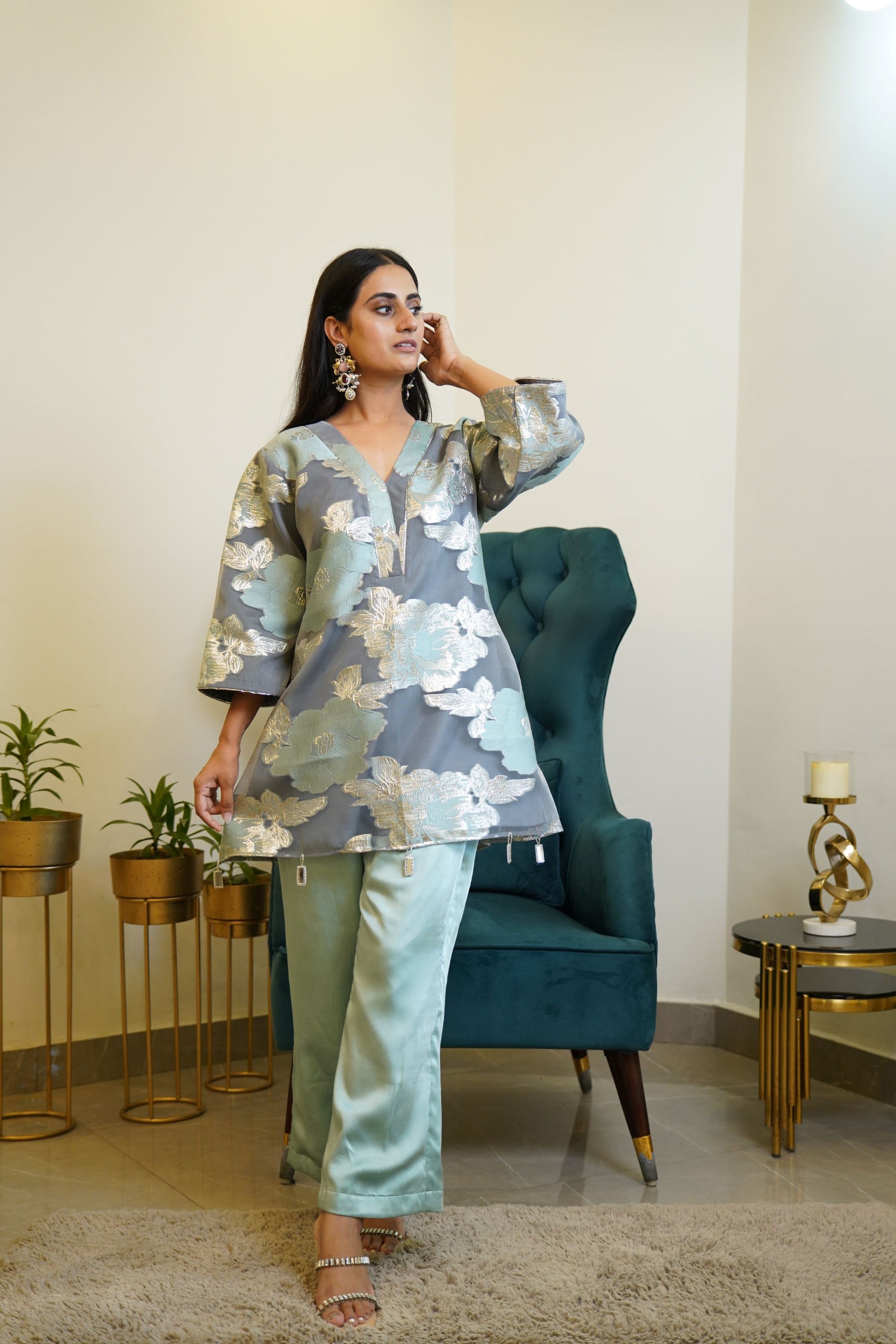 The outfit in the image is an elegant blue floral foil-printed coord set. It features a silky V-neck tunic top with wide three-quarter sleeves and a relaxed silhouette. The fabric showcases a beautiful foil floral pattern in silver and pastel blue, adding a subtle shimmer and richness to the look. The top has small tassel details along the hemline, enhancing its charm. The matching straight-fit pants are made of a smooth, shiny satin fabric in a soft sea-blue hue, complementing the top perfectly. The outfit is paired with stone-studded heels and statement earrings, making it ideal for festive gatherings, elegant brunches, or evening events.