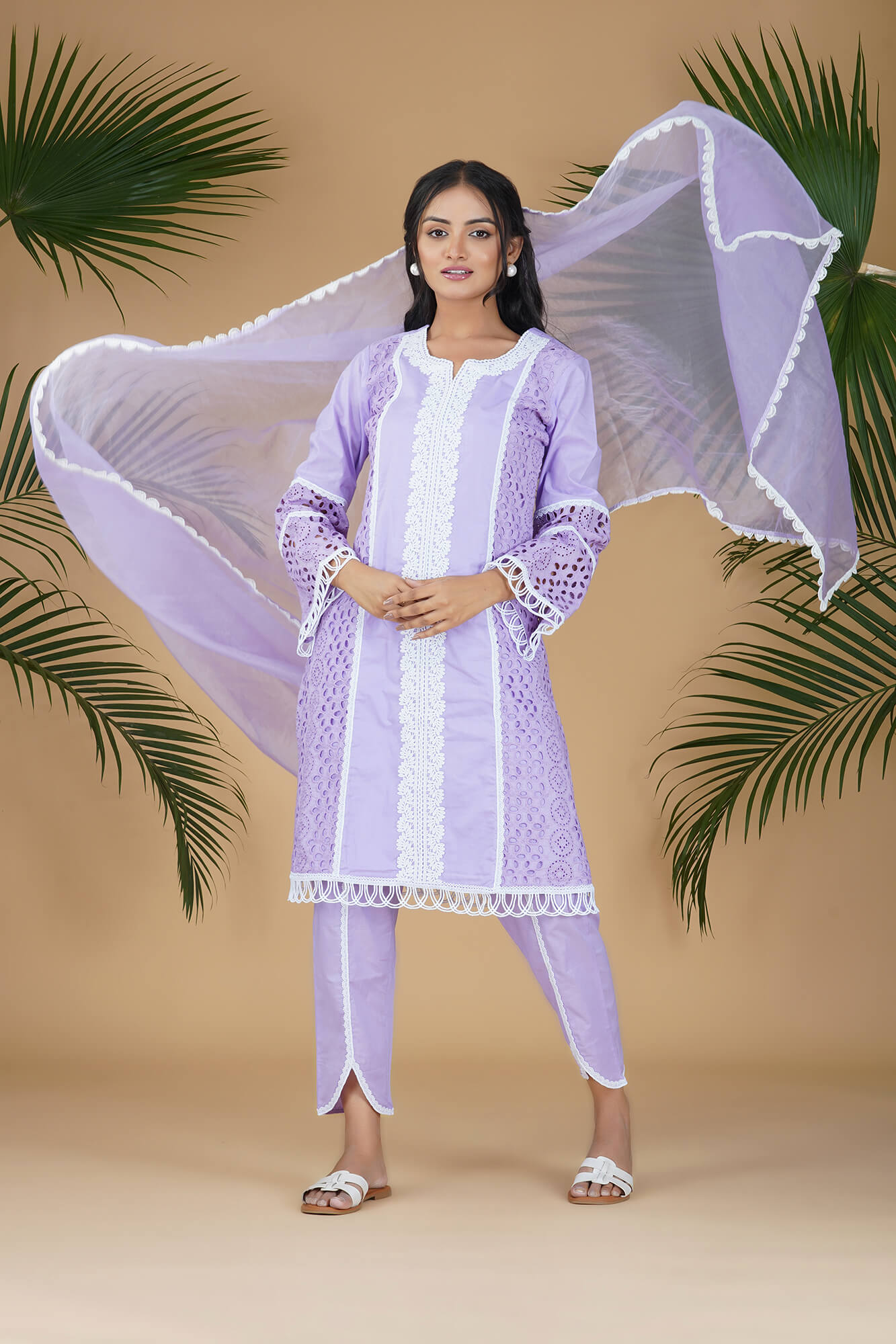Featuring A Subtle Lilac suit set with chikan panel on sides and sleeves. There is vertical lace detailing on the fron panel and adorned with scalloped lace on the hem and sleeves. Paired with straight fit pants with lace detailing. To complete the look there organza dupatta wih lace detaling.
