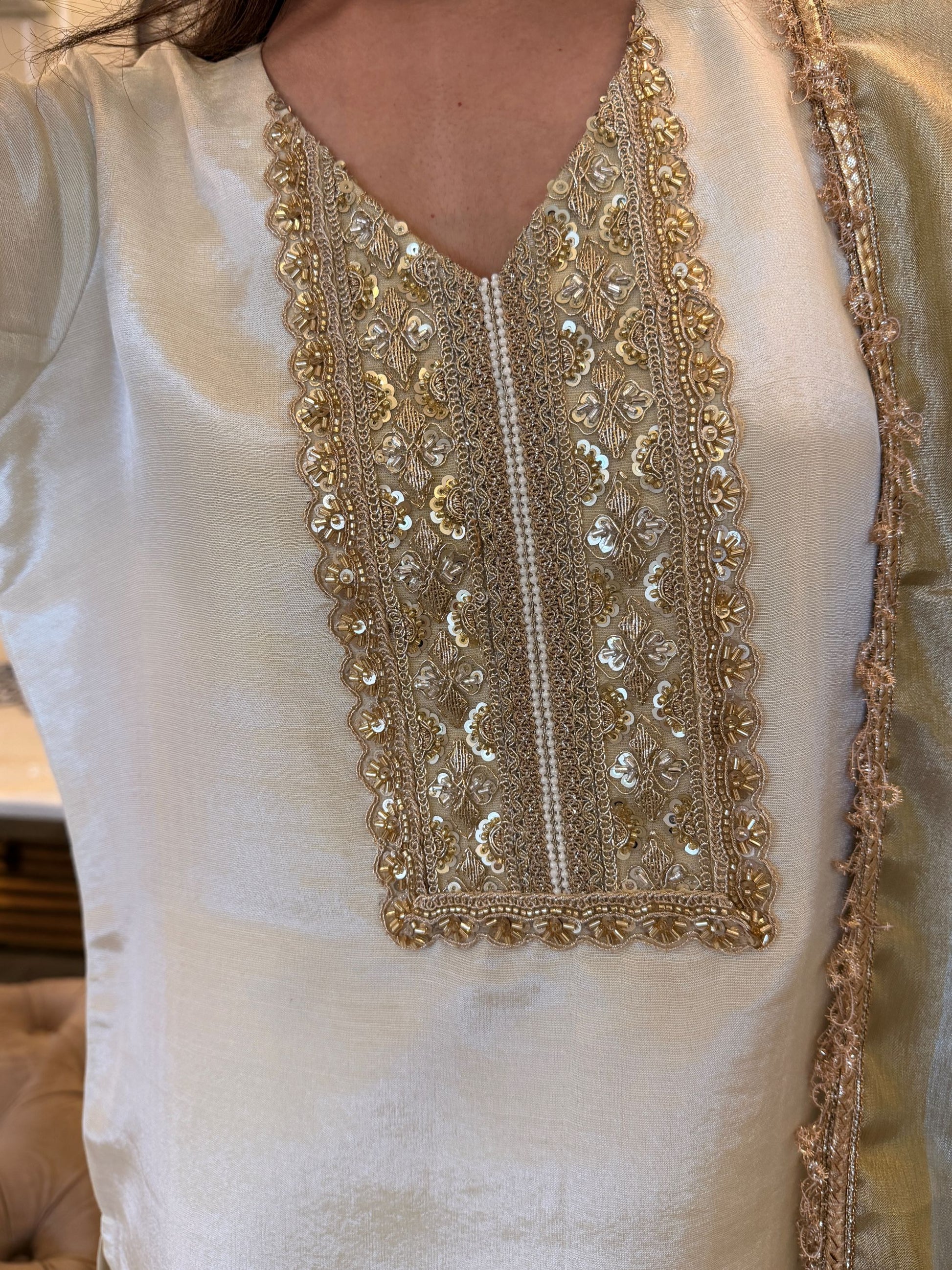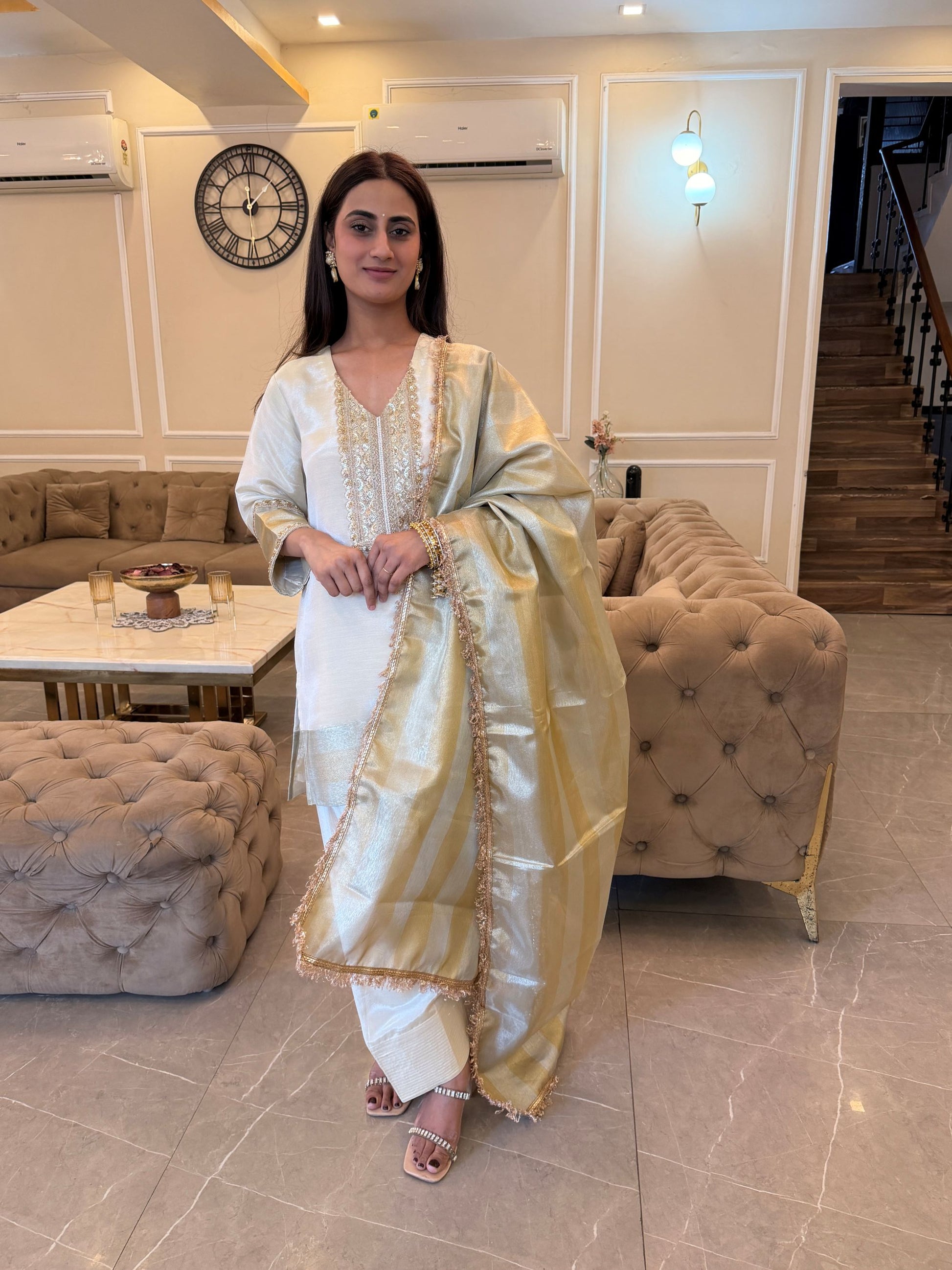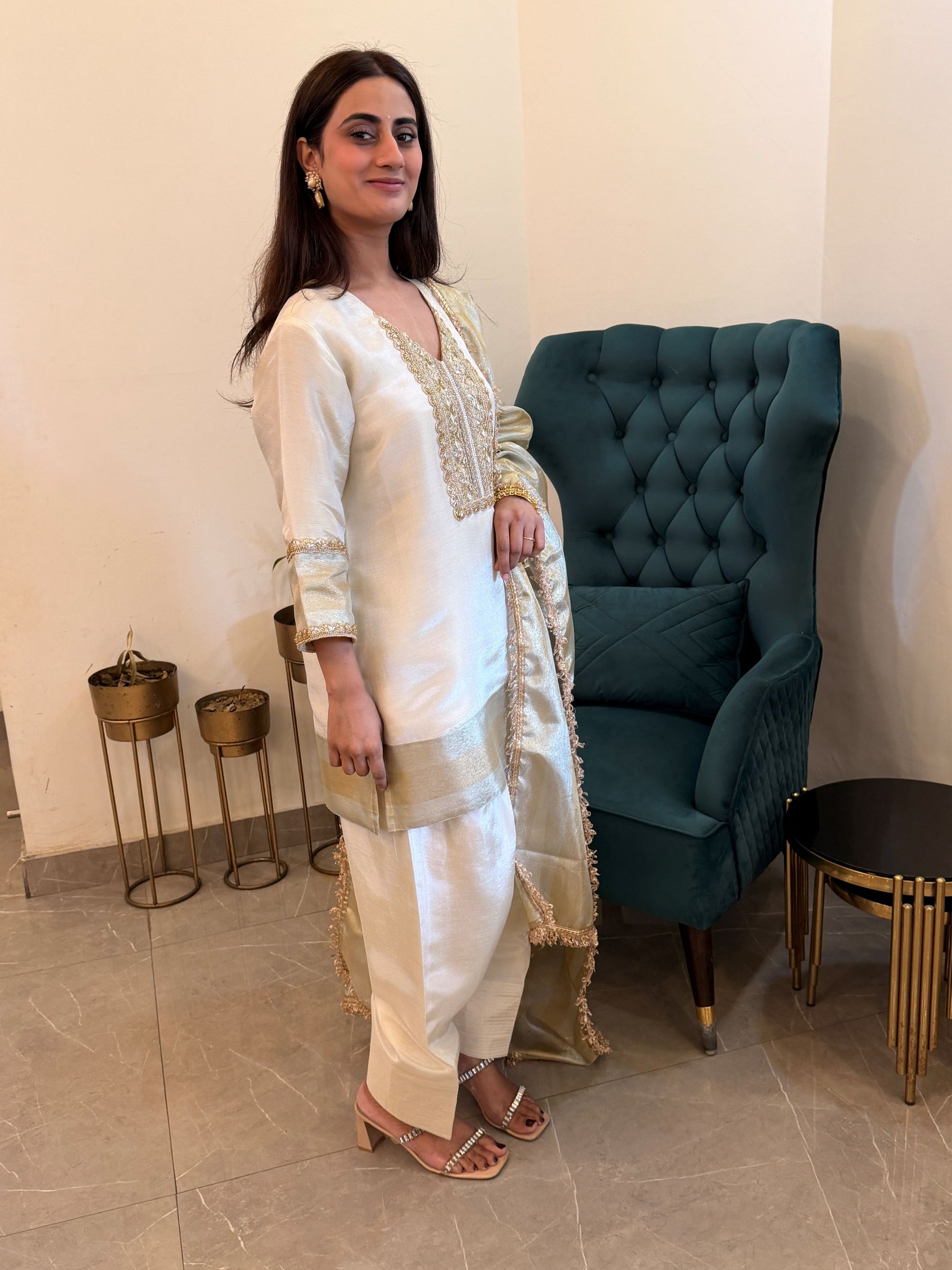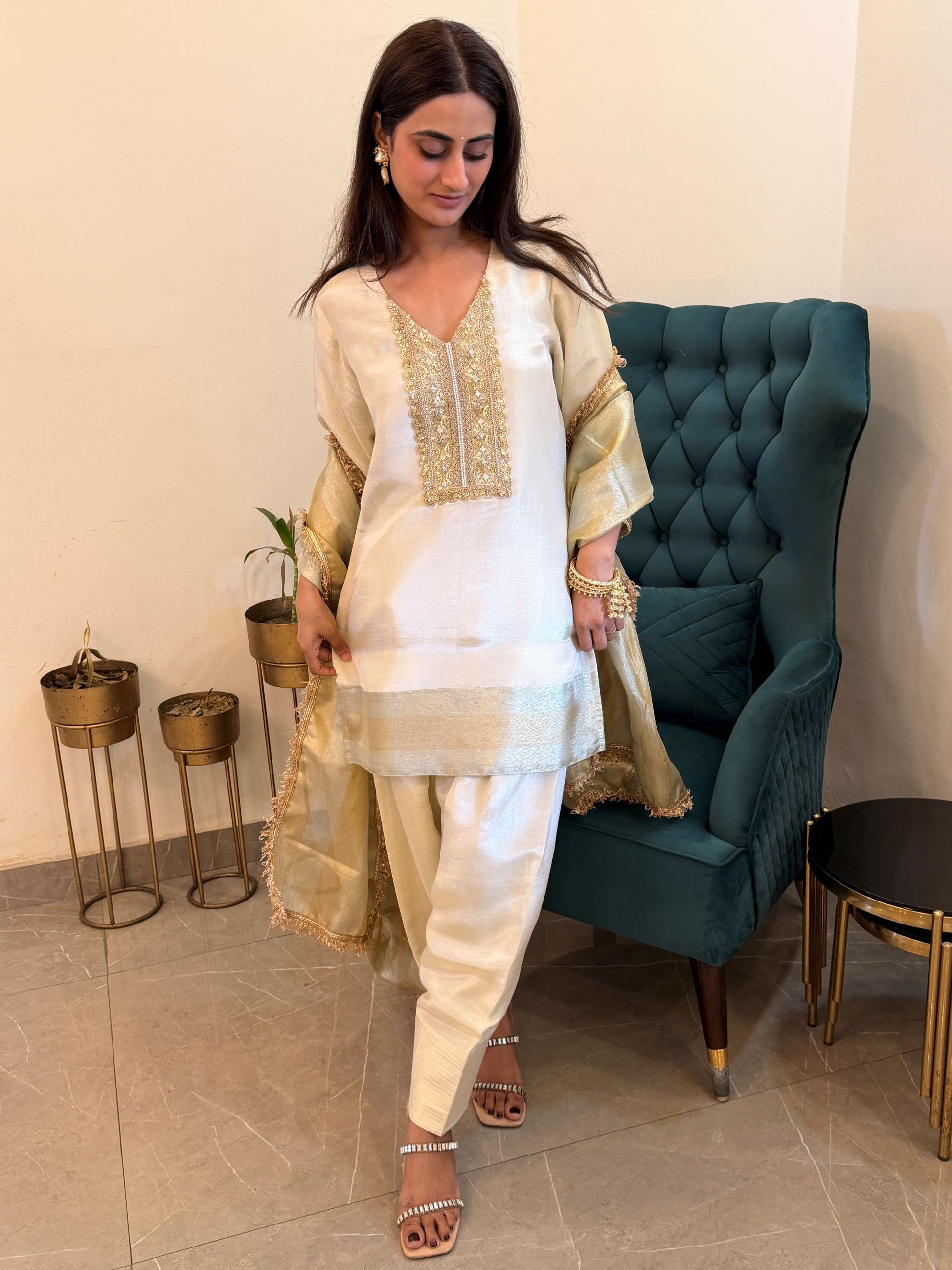 The outfit is a Ivory kurta set with rich gold embroidery. The kurta has a V-neckline detailed with intricate gold threadwork running down the front, giving it a refined, festive feel. It’s paired with Farshi Salwar that have subtle texture at the hem, keeping the look clean and balanced. The dupatta is a sheer and shimmery in a pale gold tone, finished with a delicate embroidered and tasseled border.