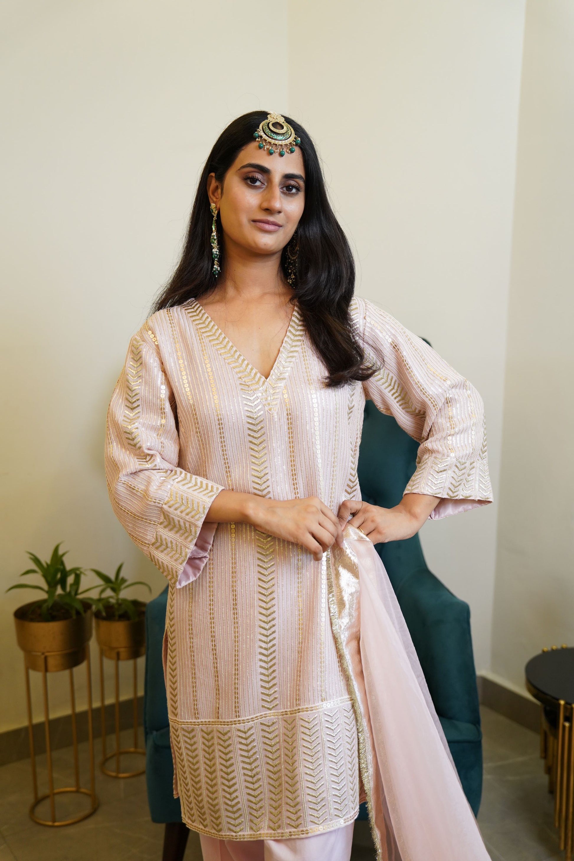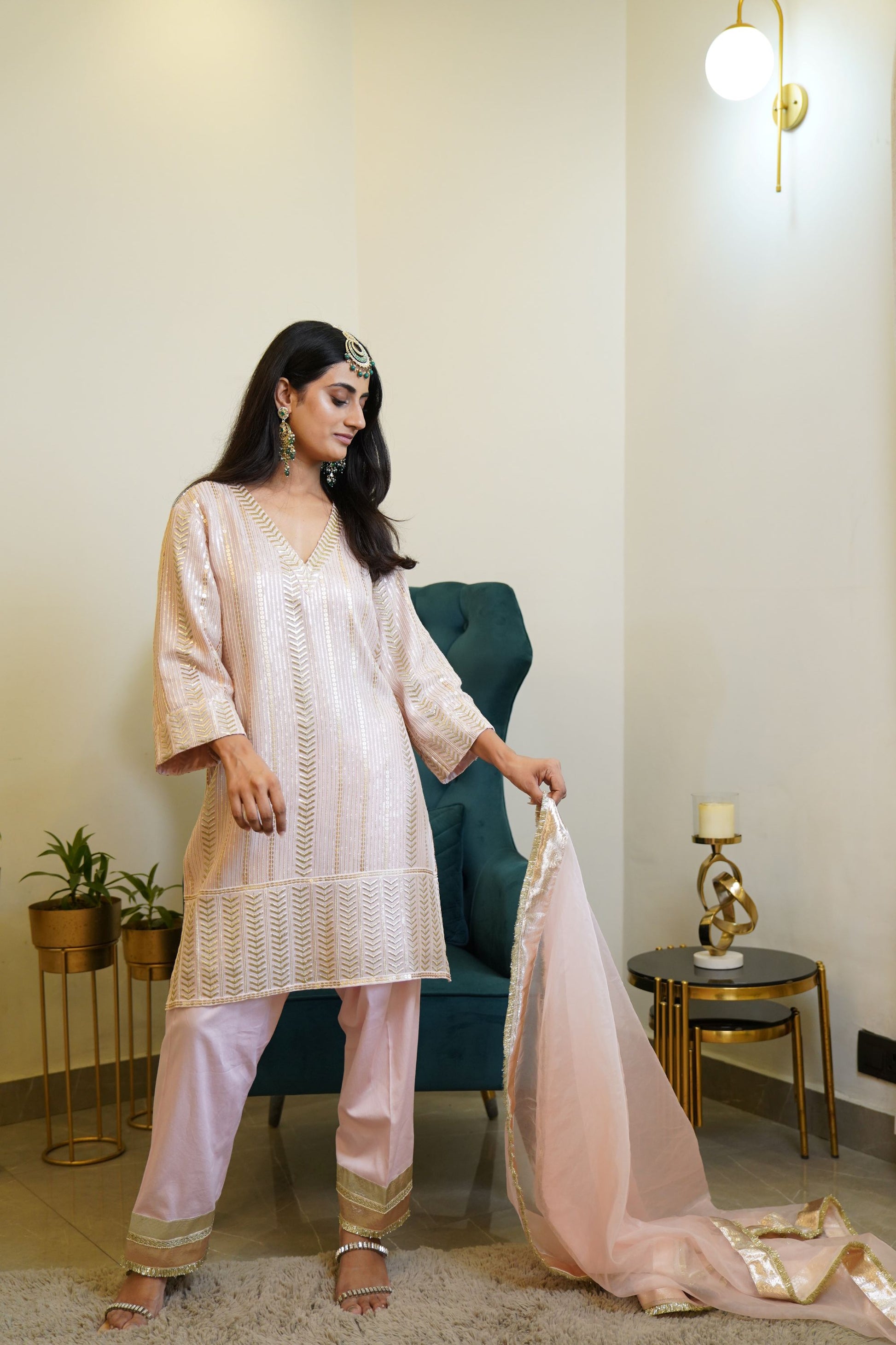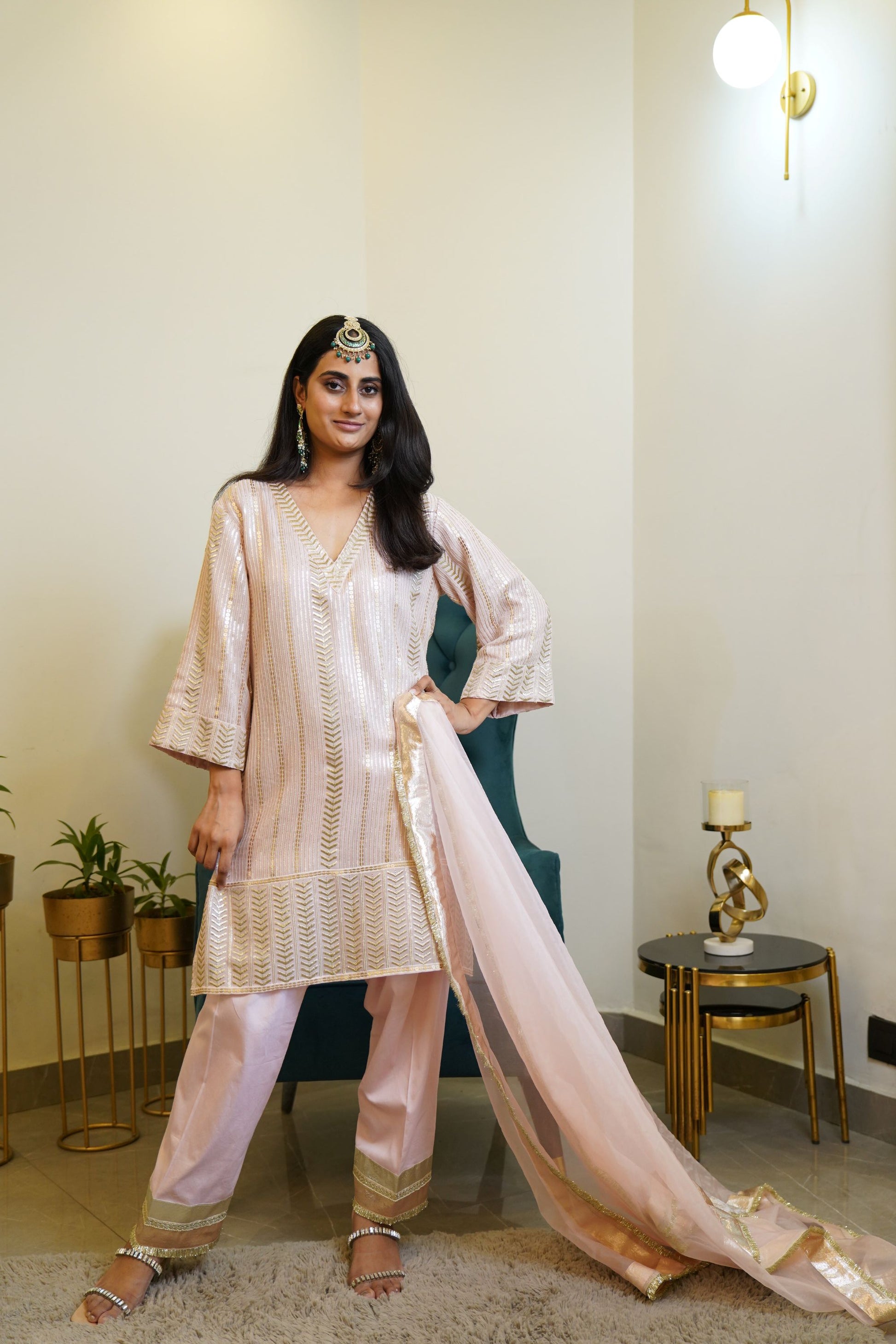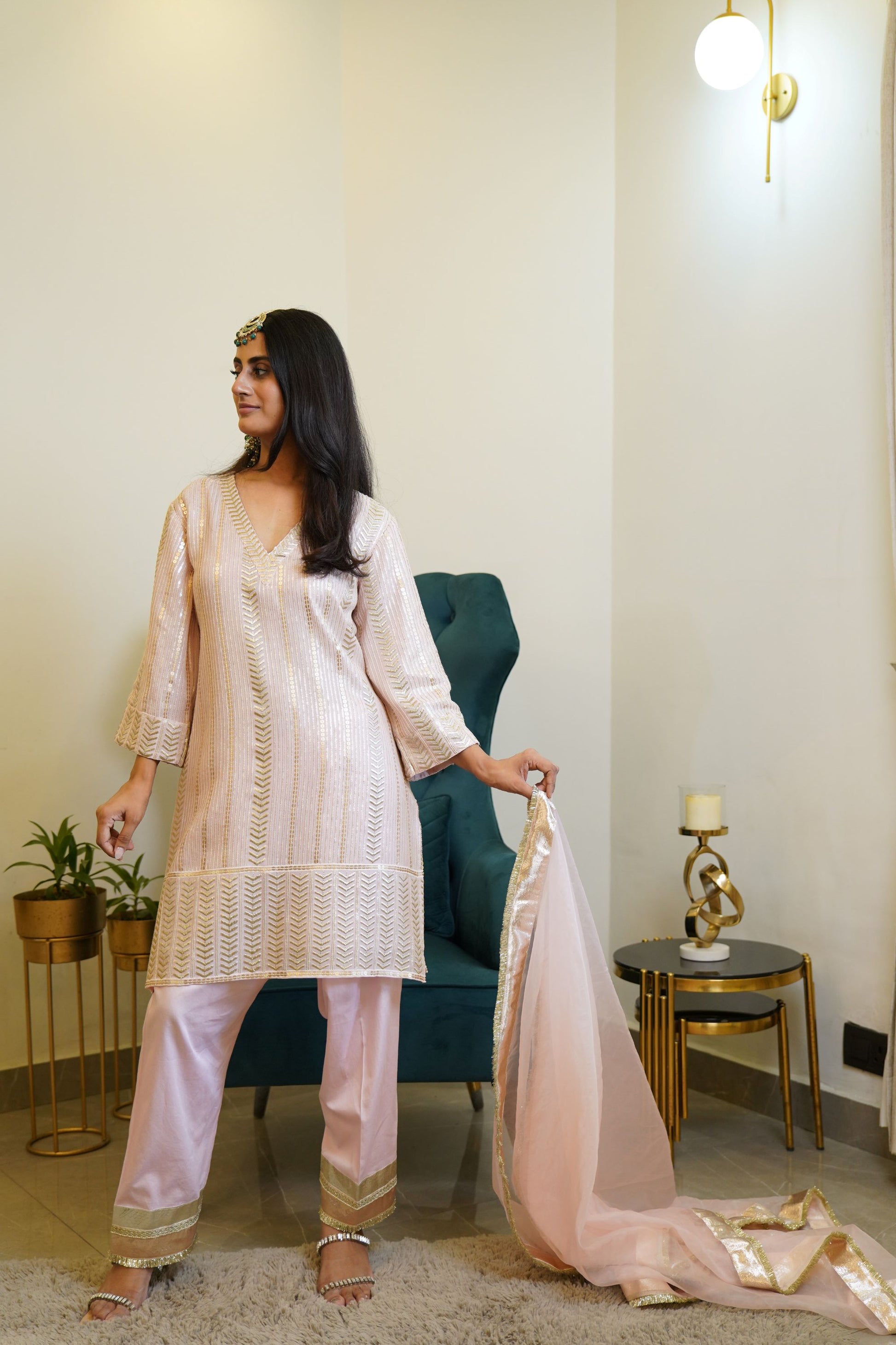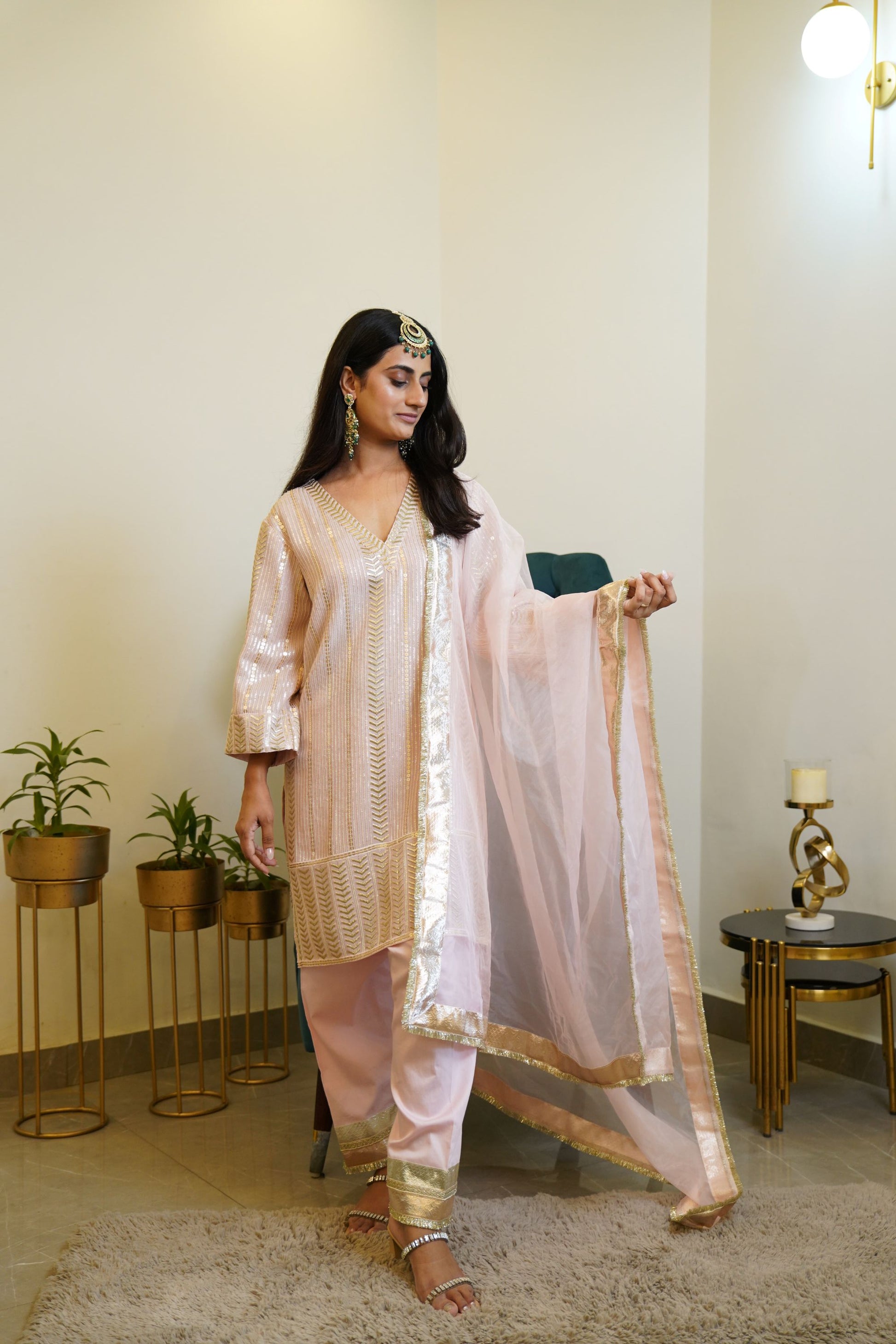 A Beautiful Muted Pink Color set in sequence embroidered straight kurta . It comes with gota . The shirt has a round neck with a V cut . It comes with salwar detailed with gota at the hem . It has been paired with pink organza dupatta detailed with gota and kiran laces .