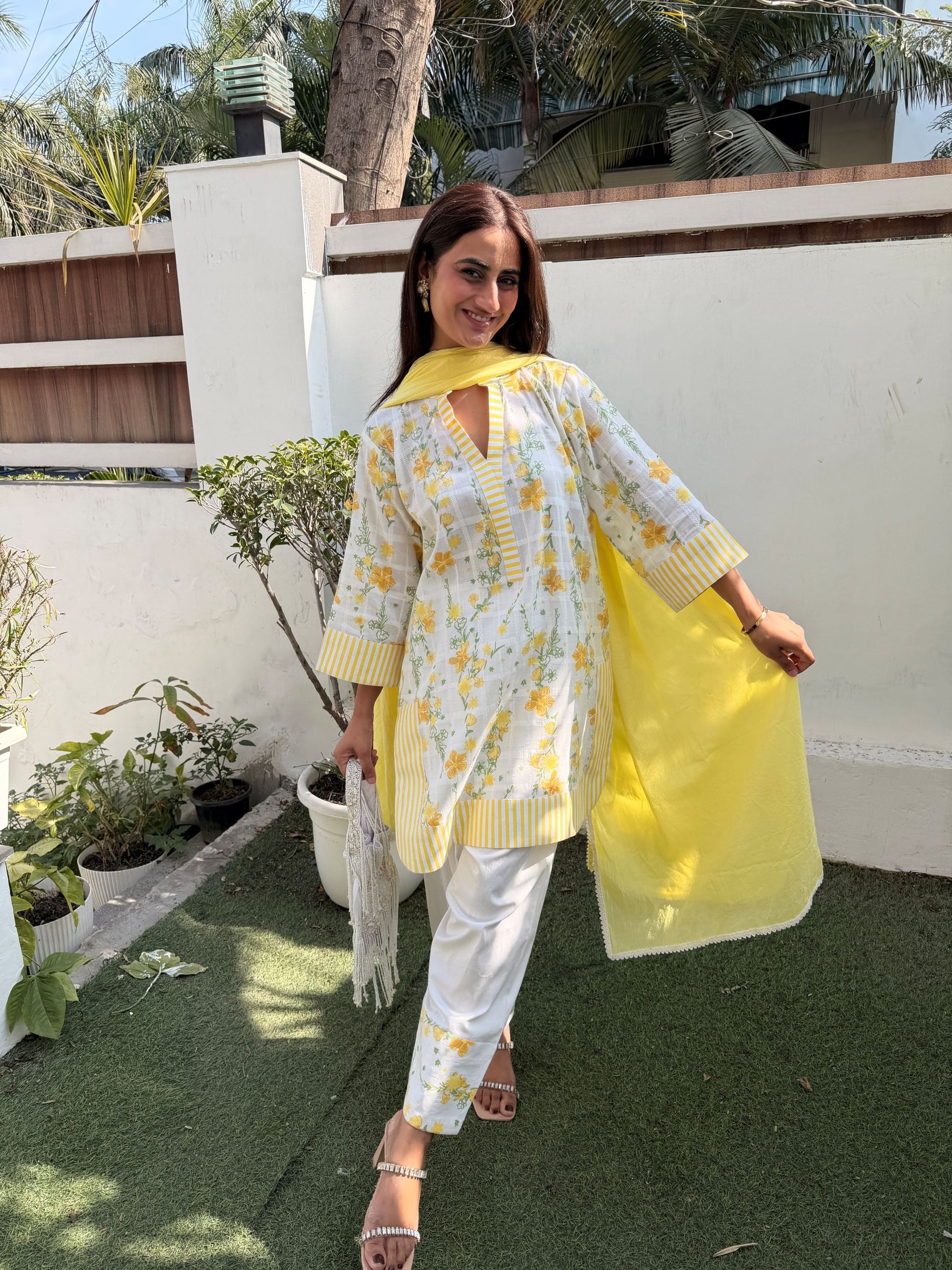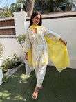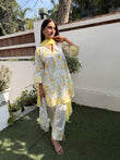 The kurta is white with delicate yellow floral prints and light green leafy detailing all over, giving it a cheerful, garden-inspired look. It has a straight, relaxed fit with three-quarter sleeves. The neckline and sleeve cuffs feature yellow-and-white striped borders, which add structure and contrast to the soft floral pattern. A matching yellow dupatta drapes loosely over the shoulders, adding a bright pop of color. The bottom is a straight, ankle-length white trouser with small yellow floral motifs near the hem, coordinated with the kurta.