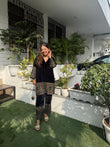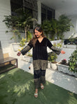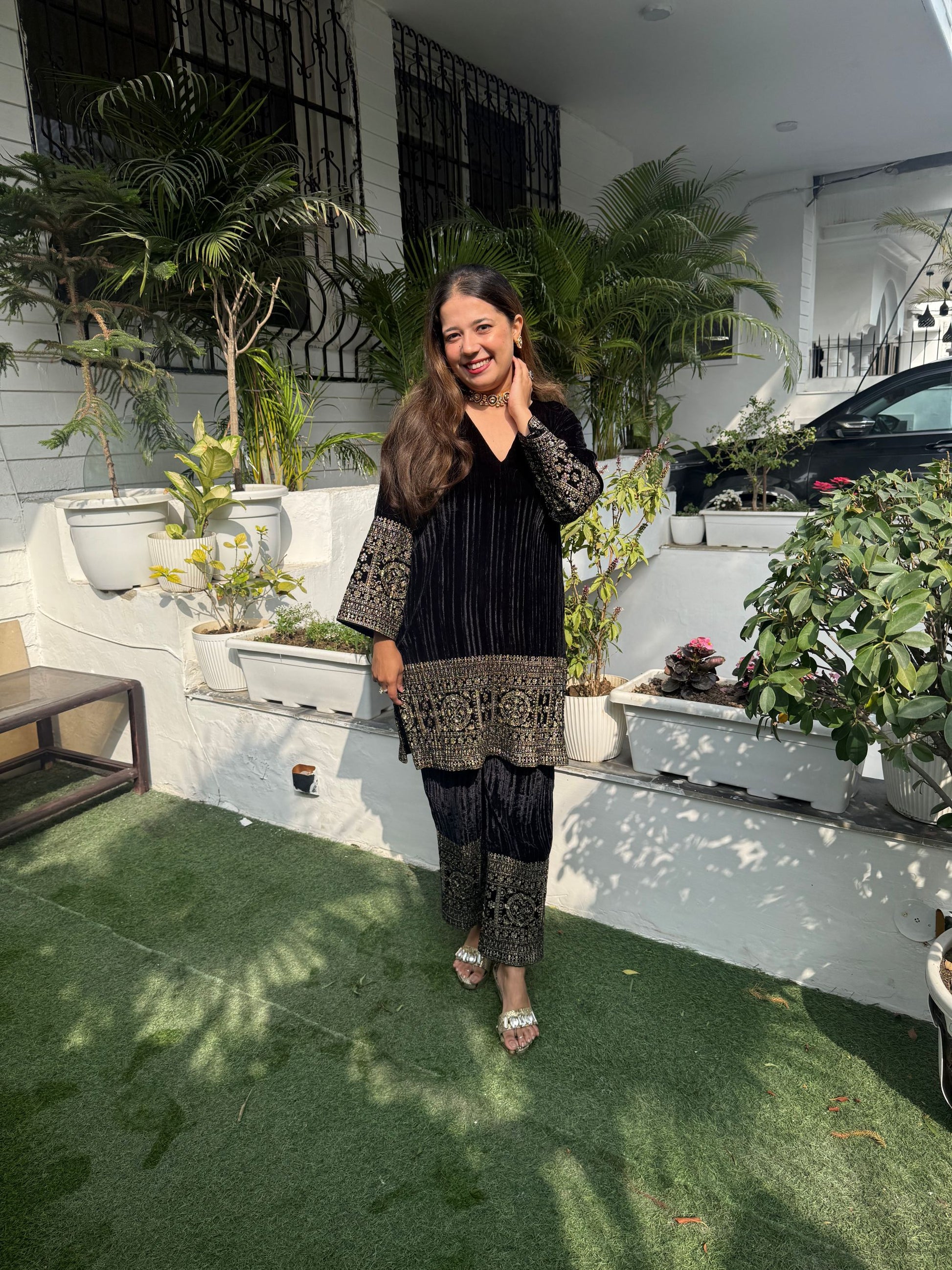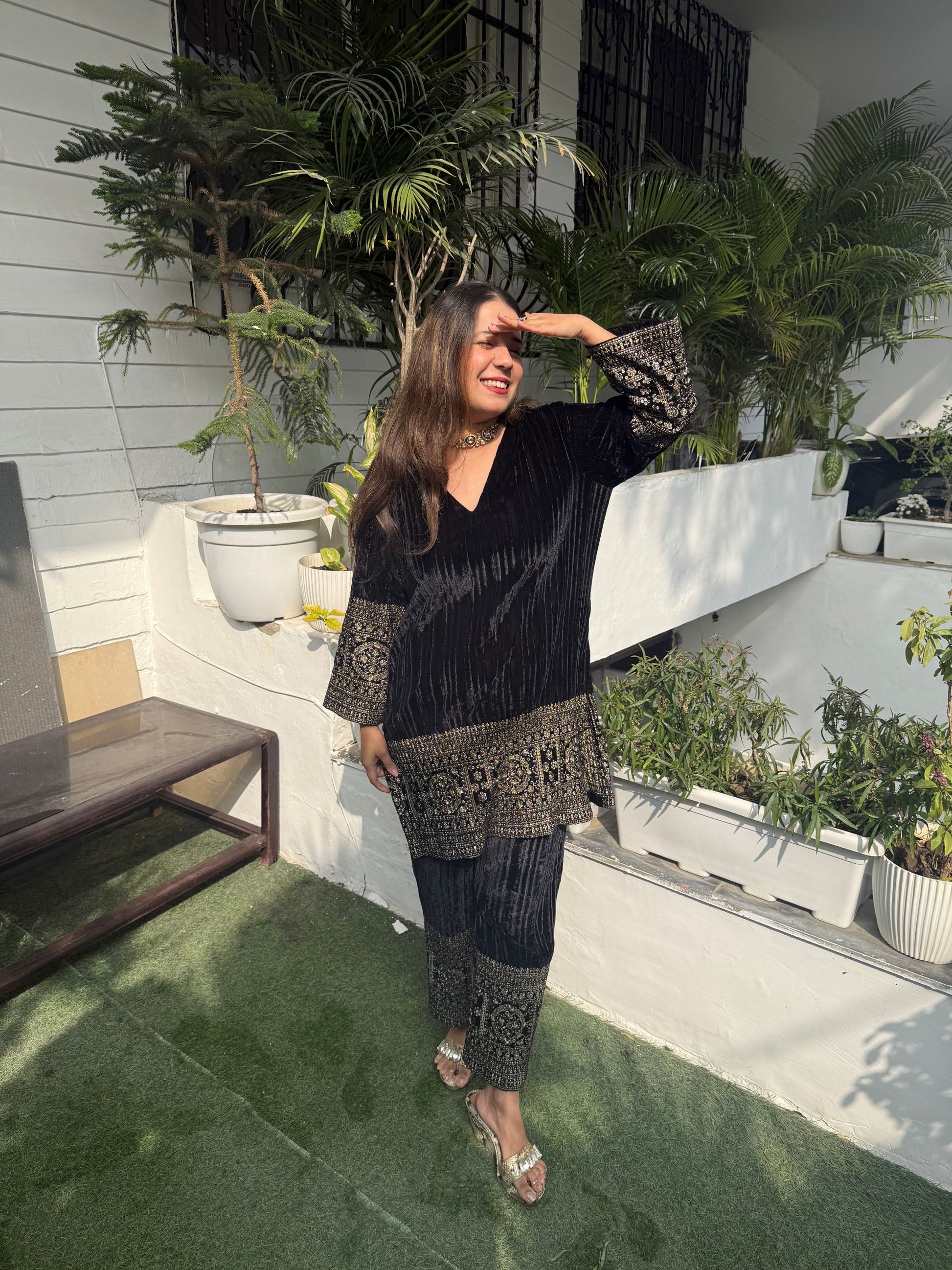 Shop this Beautiful Gold zardozi Embroidered detailing on crushed velvet ..this comes with pants in same black crushed velvet with gold embroidery.